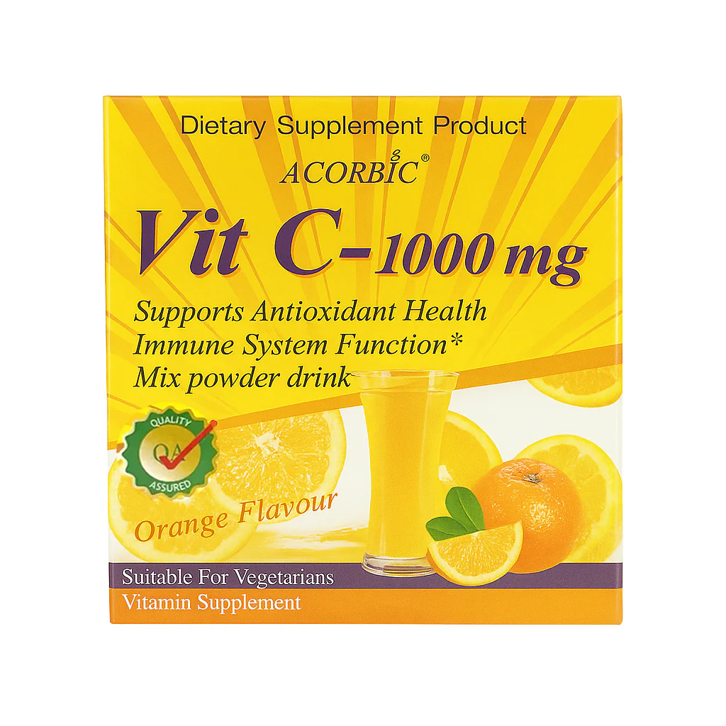 Acorbic Vit C – 1000mg Mix Powder Drink is a refreshing, antioxidant-rich vitamin blend designed to support immune function and promote healthier, glowing skin. This convenient powder drink combines Vitamin C, Vitamin D3, B-Complex, and a natural Berry Mix to help protect your body from free radical damage, support collagen production, and maintain overall wellness.