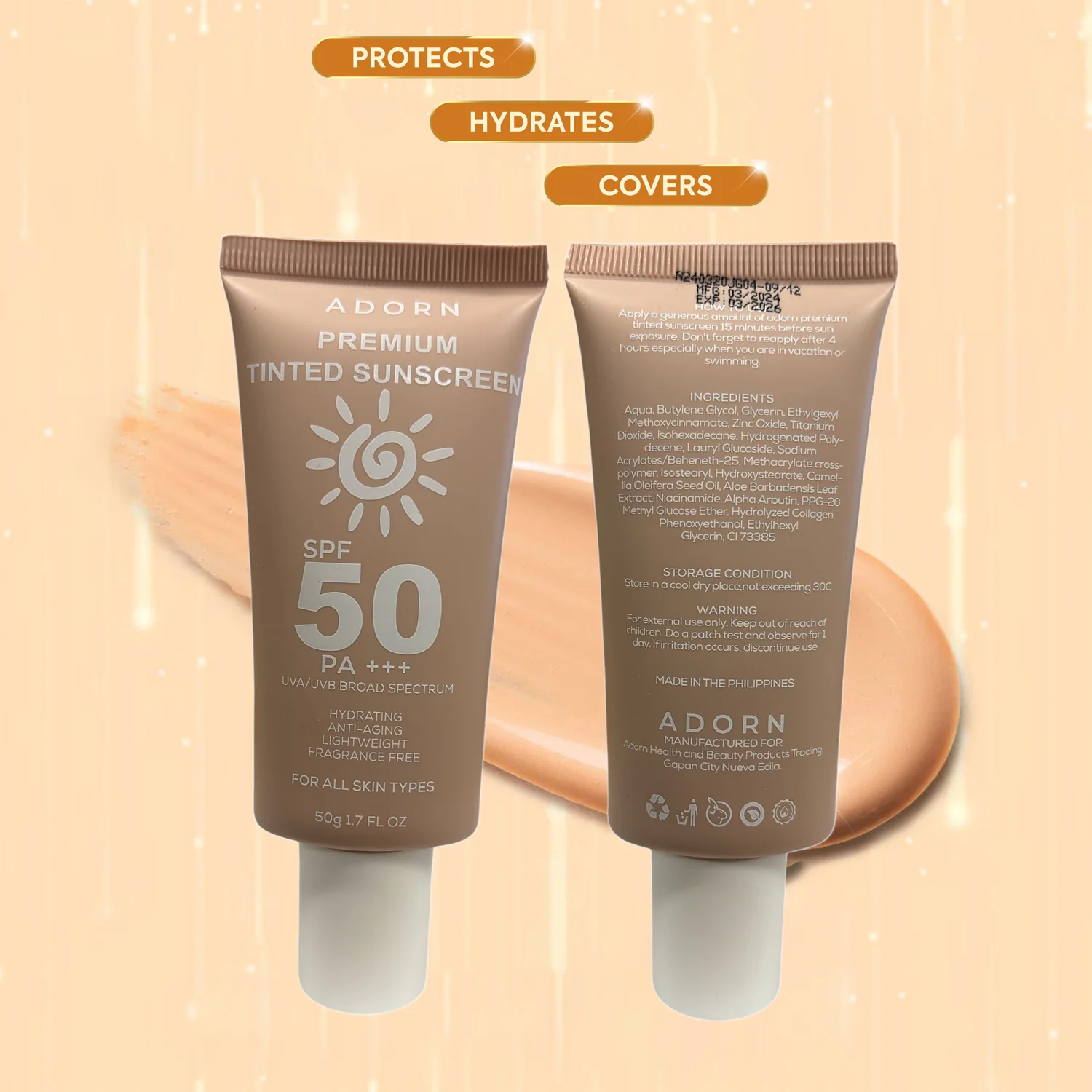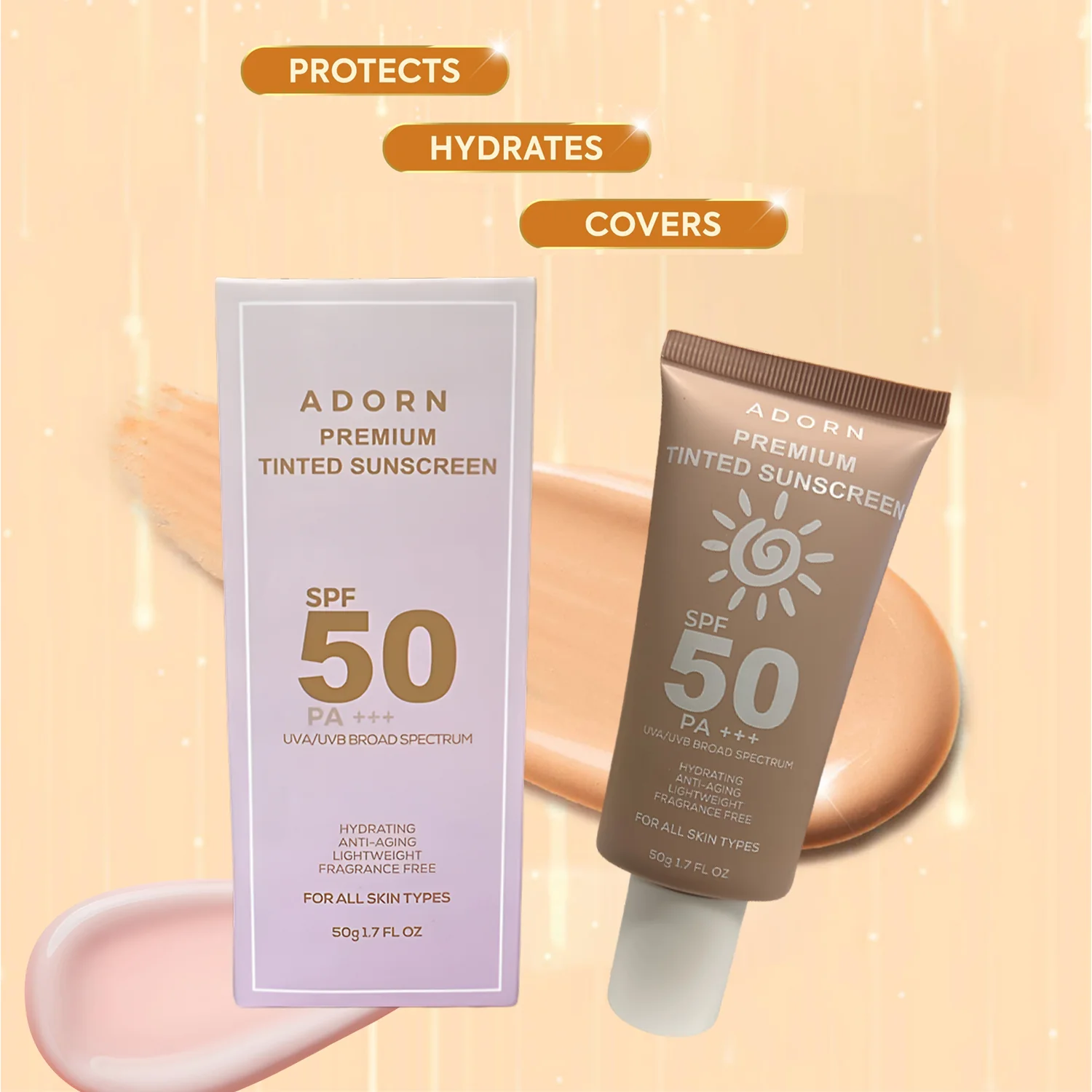 Adorn Premium Tinted Sunscreen SPF 50 PA+++ is a high-performance sunscreen that offers broad-spectrum UVA/UVB protection while providing a natural tinted coverage to even out skin tone. Infused with skin-nourishing ingredients, this lightweight sunscreen helps protect against sun damage, prevent premature aging, and enhance skin radiance.