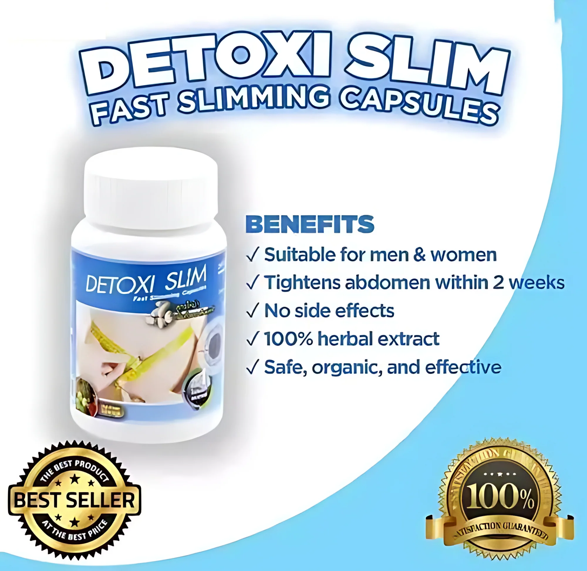 Achieve a slimmer, healthier body naturally with Detoxi Slim Fast Slimming Capsules. Specially formulated with 100% herbal extracts, this dietary supplement helps reduce appetite, block starch and sugar, and minimize fat absorption. Designed for men and women who struggle with weight loss or are resistant to other slimming products, it also supports detoxification and promotes glowing, healthy-looking skin.