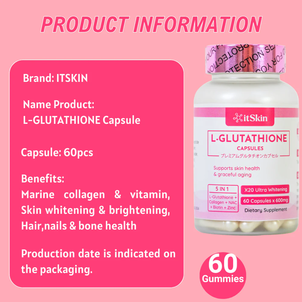 Achieve brighter, healthier skin from within with ItSkin L-Glutathione Capsules, your go-to supplement for skin whitening and overall wellness.
