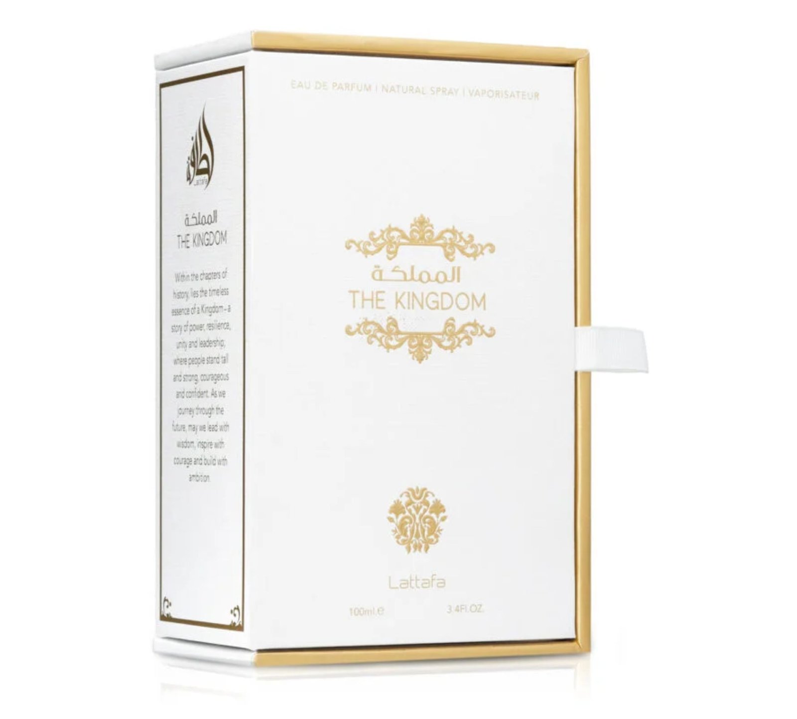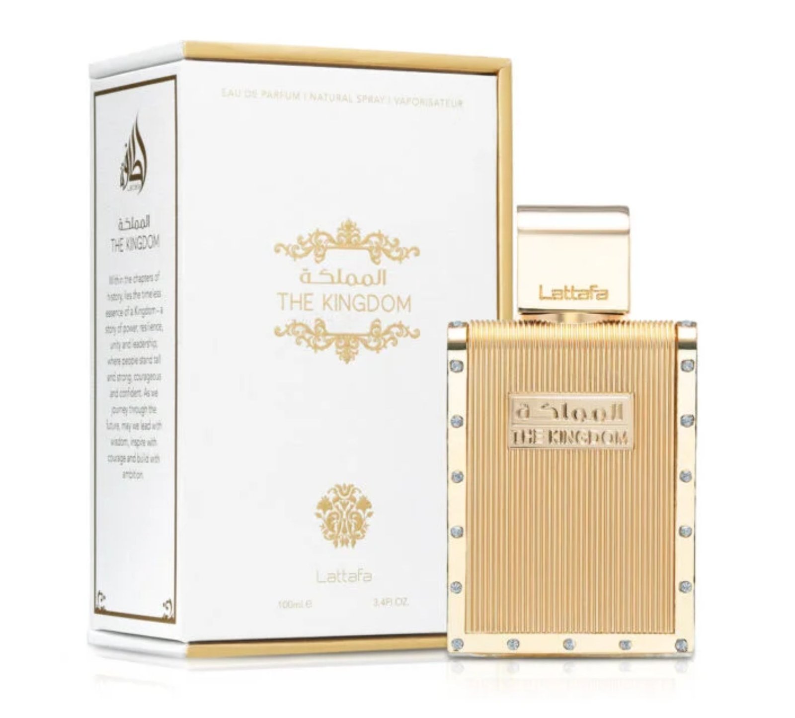 Experience the regal scent of LATTAFA THE KINGDOM Men Eau de Parfum. This 3.4-ounce fragrance combines the refreshing notes of sage, lavender, and mint with a warm heart of tobacco, vanilla, and orange flower. The base is a rich blend of benzoin, tonka bean, and labdanum, creating a lasting, sophisticated aroma. Perfect for any occasion, LATTAFA THE KINGDOM embodies elegance and confidence in a beautifully designed bottle. Rule your day with this timeless and captivating scent.