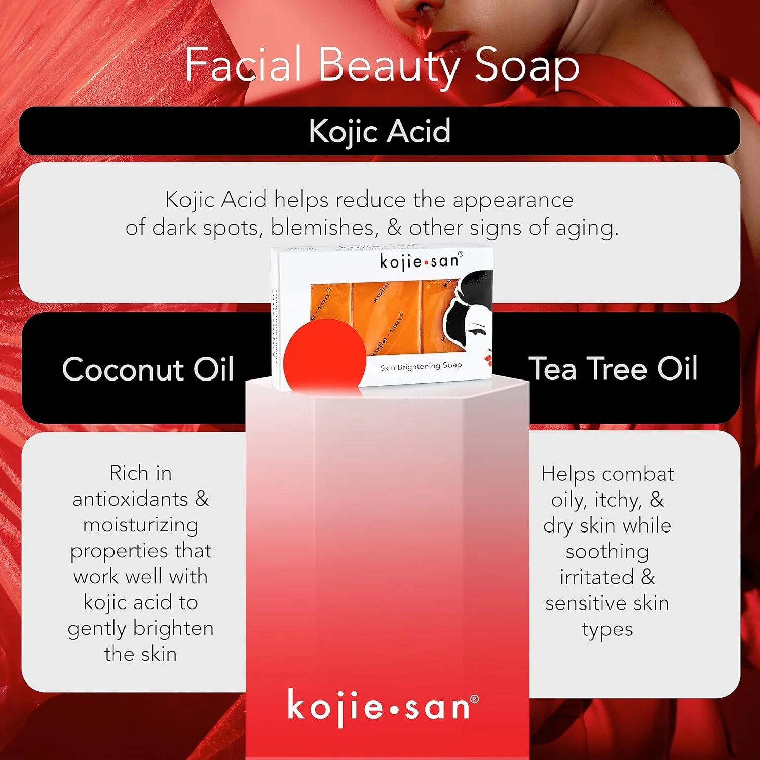 - Skin lightening & brightening face & body soap. Main active ingredient is kojic acid.