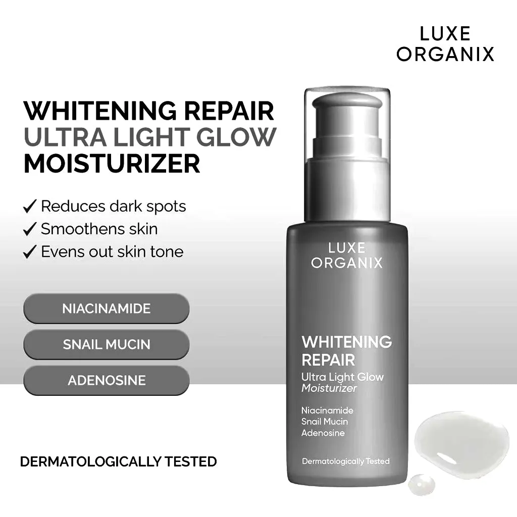 Reveal visibly brighter, smoother, and more nourished skin with the Luxe Organix Whitening Repair Ultra Light Glow Moisturizer. This lightweight, fast-absorbing moisturizer is formulated with Niacinamide, Snail Secretion Filtrate, and Adenosine, working together to fade dark spots, reduce hyperpigmentation, and improve overall skin tone and texture.