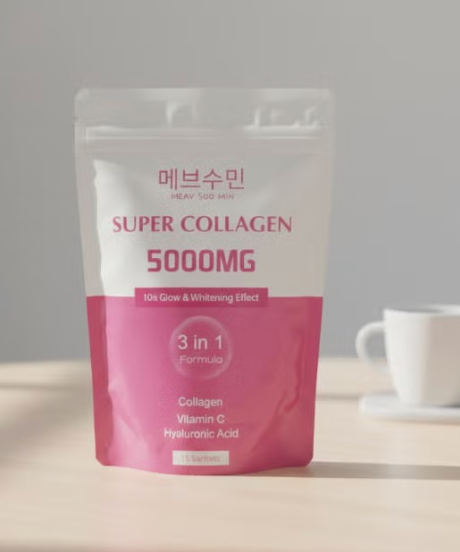 Meav Soo Min Super Collagen 5000mg 3-in-1 is a powerful beauty supplement designed to support skin elasticity, joint health, and overall vitality. Each serving delivers high-dose collagen along with essential vitamins and minerals, promoting firmer, smoother skin, stronger nails, and healthier hair.