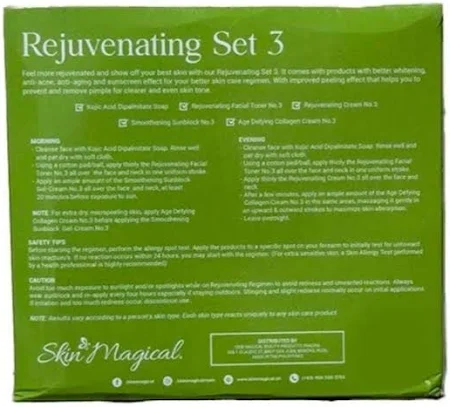 Skin Magical Rejuvenating Set No. 3 is a complete skincare system specially formulated to whiten, smoothen, and rejuvenate the skin. Designed for those with stubborn dark spots, acne scars, texture, and dullness, this advanced set helps renew the skin, reduce blemishes, tighten pores, and reveal a clearer, healthier, and glowing complexion.