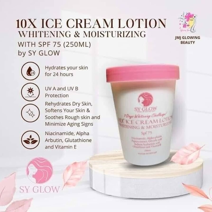 SY Glow Ice Cream Whitening Lotion is a luxurious body lotion formulated to brighten and hydrate the skin. Its creamy, lightweight texture absorbs quickly, leaving the skin soft, smooth, and radiant. Enriched with skin-loving ingredients, it helps reduce dullness, even out skin tone, and promote a glowing complexion. Perfect for daily use, it keeps your skin feeling refreshed and nourished all day.